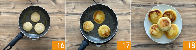 Coloque um fio de óleo em uma frigideira antiaderente, acomode os pãezinhos dentro 16 e deixe cozinhar por cerca de 5 minutos de cada lado, em fogo moderado, até que fiquem bem dourados 17. Transfira para um prato e sirva seus pãezinhos ainda quentes 18.