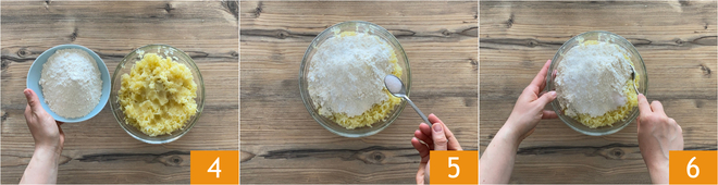 Adicione à purê de batatas a farinha 4 e o sal 5. Misture os ingredientes, tentando uniformizá-los 6.