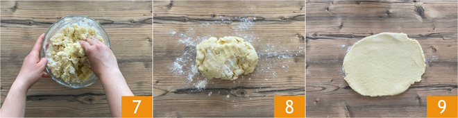 Amasse com as mãos até obter uma mistura homogênea 7. Transfira para uma superfície para trabalhar mais facilmente 8 e estenda até ter uma espessura de meio cm 9.