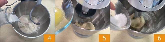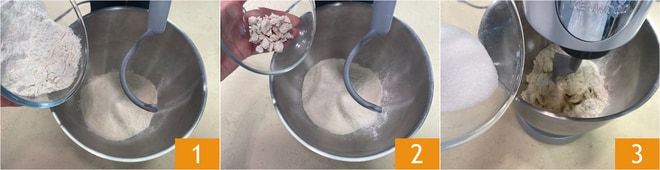 Para preparar os pãezinhos de leite, primeiro coloque na batedeira a farinha manitoba, adicione a farinha 00 1, o fermento esfarelado 2 e o açúcar 3.