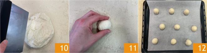 Divida a massa 10 em 30 pedaços de 30 g cada. Para cada pedaço, pegue as bordas e leve-as ao centro da massa, então faça movimentos circulares 11 e belisque levemente a base para selar o fechamento. À medida que você os faz, coloque os pãezinhos, um pouco distantes uns dos outros, em assadeiras forradas com papel manteiga 12 e deixe fermentar por 30 minutos.