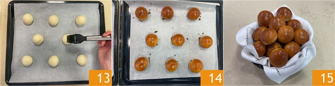 Em uma tigelinha, misture uma gema e o creme de leite, e com essa mistura pincele a superfície dos pãezinhos 13. Asse em forno estático a 180°C por 30 minutos 14, uma vez assados, deixe esfriar. Seus pãezinhos de leite estão prontos para serem recheados com recheios doces ou salgados 15.