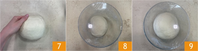 Assim que o sal for absorvido, transfira a massa para a superfície de trabalho e trabalhe até formar uma esfera 7, depois coloque-a em uma tigela e cubra com filme plástico 8. Deixe fermentar em um local seco e longe de correntes de ar por cerca de 2 horas ou até dobrar de volume 9.