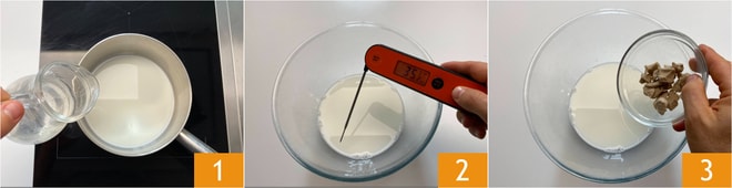 Para preparar os rolinhos de mirtilo, coloquem em uma panelinha o leite e a água 1, aqueçam até atingir 35° 2 e fora do fogo, adicionem o fermento esfarelado 3.