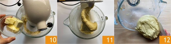 Incorporem a manteiga 10 e deixem o gancho trabalhar por 3-4 minutos, até que a massa esteja ligada 11. Transfiram a mistura para a bancada levemente enfarinhada 12.