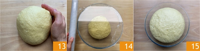 Trabalhem até deixar a massa lisa, formem uma bola 13 e coloquem em uma tigela. Cubram com filme plástico 14 e deixem crescer no forno desligado com a luz acesa por cerca de 2 horas. Deve dobrar de volume 15.
