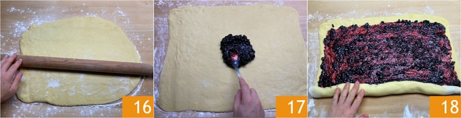 Estendam a massa sobre uma bancada levemente enfarinhada formando um retângulo de cerca de 50 x 35 16. Espalhem a geleia 17 e enrolem a massa pelo lado mais comprido 18.