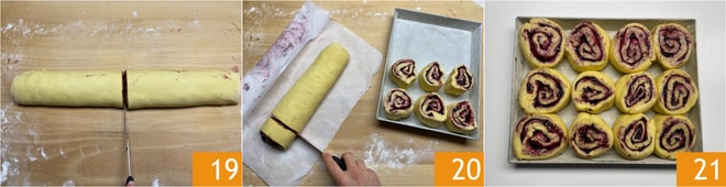 Dividam ao meio 19 e coloquem em uma bandeja com filme plástico, deixem esfriar na geladeira por meia hora. Cortem os dois rolos e obtenham 12 rolinhos 20, coloquem-nos em uma assadeira de 28 x 21 cm forrada com papel manteiga 21, cubram com filme plástico e deixem crescer por uma hora. Assem em forno estático pré-aquecido a 200° por cerca de 20 minutos.