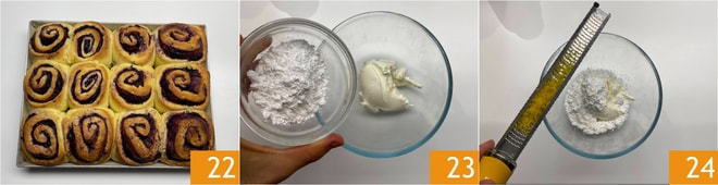 Retirem os rolinhos do forno e deixem esfriar 22. Enquanto isso, preparem a cobertura: em uma tigela coloquem o cream cheese, o açúcar 23 e a casca de limão 24.