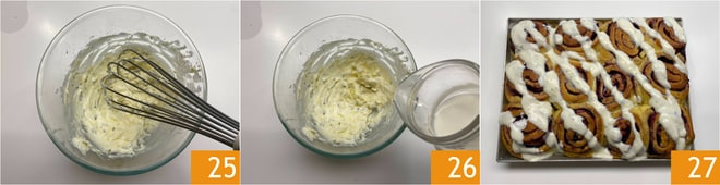 Misturem todos os ingredientes usando um fouet 25 e adicionem o leite em fio, até obter uma consistência lisa. Cubram os rolinhos de mirtilo com a cobertura 27 e sirvam.