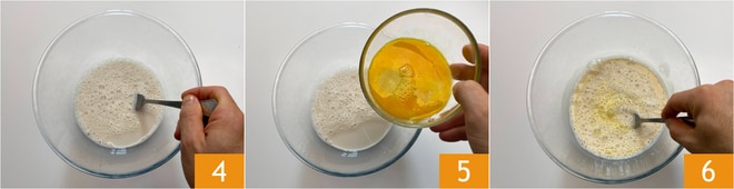 Misturem para dissolvê-lo 4, em seguida, adicionem os ovos 5 e batam para integrar a mistura 6.