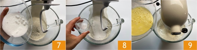 Na tigela da batedeira planetária, coloquem a farinha, o açúcar 7 e o sal 8. Ligue o gancho na velocidade baixa 1 -1,5 e adicione a baunilha. Despejem a mistura ainda morna 9.