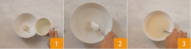 Para preparar os pãezinhos macios com anchovas, comece dissolvendo o fermento biológico esfarelado em uma tigela, adicione a água em temperatura ambiente 1 e o açúcar 2. Misture bem tudo com um garfo 3.