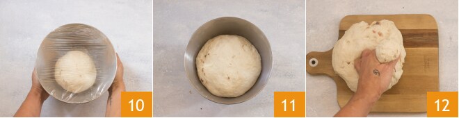 Coloque a massa de volta na tigela da batedeira e cubra com filme plástico 10, deixe crescer por cerca de 2 horas, até dobrar de volume 11. Em seguida, comece a dividir a massa em porções de 60 g cada, no total você obterá cerca de 13 peças 12.
