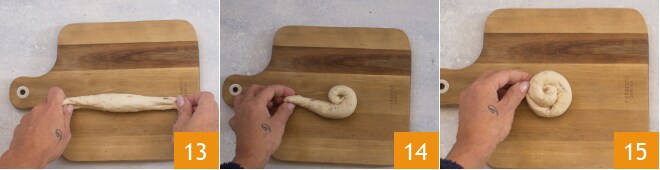 Faça um rolinho de cerca de 20 cm 13 e depois enrole-o sobre si mesmo firmemente 14 até formar um caracol 15.