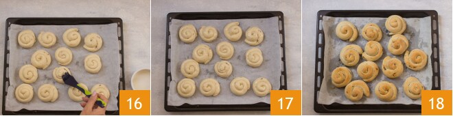 Arrume os pãezinhos em uma assadeira com papel manteiga e pincele com um pouco de óleo vegetal 16. Cubra e deixe descansar por mais 15 minutos 17. Enquanto isso, aqueça o forno a 180°C e asse os pãezinhos por cerca de 20 minutos 18.