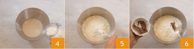 e transfira tudo para a tigela da batedeira. Em seguida, adicione a farinha 4, o sal 5 e os filés de anchovas, ou sardinhas, escorridos do óleo 6.