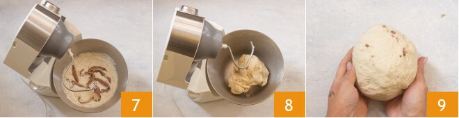 Coloque o gancho 7 e ligue a batedeira por cerca de 5 minutos ou até que todos os ingredientes estejam bem incorporados 8. Transfira para uma superfície e trabalhe por alguns instantes, até formar uma bola lisa 9.