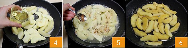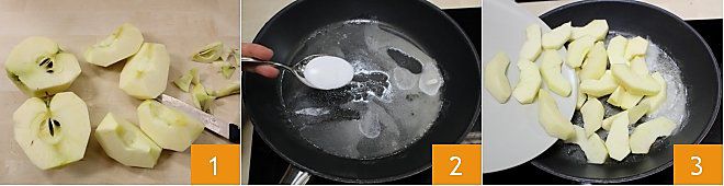 Para preparar o pain perdu com maçãs caramelizadas, comece por preparar estas últimas: descasque as maçãs lavadas, retire o miolo e corte em fatias não muito finas 1. Coloque a manteiga em uma frigideira, derreta e acrescente o açúcar 2, depois adicione as fatias de maçã 3.