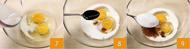 Agora passe para a preparação do pain perdu: em uma tigela quebre os ovos e adicione o leite 7, o extrato de baunilha 8 e o açúcar 9.