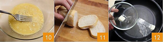 Bata tudo com um garfo para misturar bem os ingredientes 10. Corte fatias (não muito grandes, se forem, divida-as ao meio) de pão amanhecido 11 e derreta manteiga suficiente para cobrir o fundo de uma frigideira antiaderente 12.