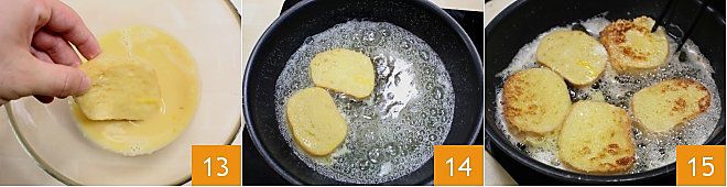 Molhe as fatias de pão de ambos os lados na massa 13 e coloque-as diretamente na frigideira para fritar 14. Deixe dourar bem de ambos os lados, virando com uma pinça 15 e, uma vez prontas, coloque sobre papel toalha de cozinha.