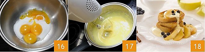 Enquanto isso, prepare o zabaione (clique aqui para mais instruções) batendo com um batedor elétrico as gemas com o açúcar em uma panela em banho-maria (16-17): adicione a canela e o vinho, uma colher de cada vez, sempre batendo até completa absorção. Quando o zabaione estiver pronto, você pode montar o prato: coloque três fatias de pão sobrepostas em um prato de servir, adicione ao lado do pão algumas fatias de maçã caramelizada e finalize com a adição de algumas colheres de zabaione 18: está pronto o seu pain perdu com maçãs caramelizadas!