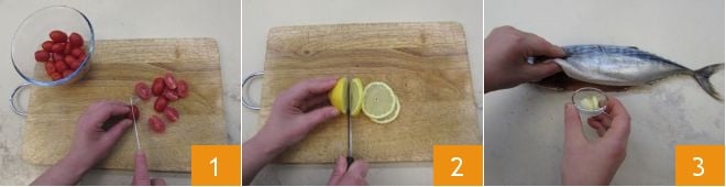 Para preparar o bonito no papelote com tomatinhos, comece lavando e cortando os tomatinhos ao meio 1. Reserve-os. Em seguida, pegue o limão não tratado, lave-o e corte-o em fatias finas 2 e divida cada uma ao meio. Reserve-as. Prossiga com a preparação do peixe. Faça um corte da cabeça até a metade do ventre do bonito e eviscere-o. Lave sob água corrente para eliminar os resíduos de sangue. Salgue e apimente o ventre do peixe e coloque o dente de alho descascado e cortado em pedaços 3.