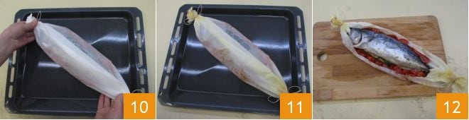 Transfira o bonito para uma assadeira 10 e asse no forno estático pré-aquecido a 200°C por 25 minutos (se usar o forno ventilado a 180°C por 15 minutos). Após o tempo de cozimento, retire o bonito do forno 11 e sirva o seu bonito no papelote com tomatinhos ainda quente no papel manteiga 12!