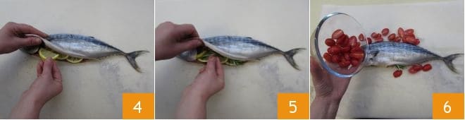 Insira no ventre também as fatias de limão 4 e o alecrim 5, lavado e seco, para aromatizar. Agora, pegue um pedaço de papel manteiga grande o suficiente para envolver o bonito. Coloque o peixe no centro e disponha ao redor os tomatinhos 6.