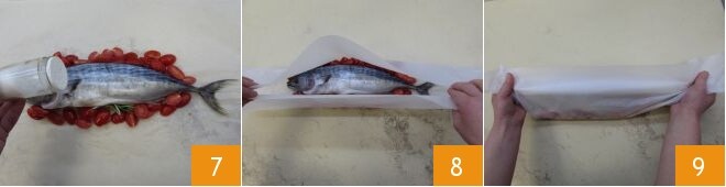 Salgue 7 e apimente. Feche o papel manteiga 8 envolvendo o bonito dentro e enrole as extremidades 9. Selar as extremidades com barbante para manter o papel manteiga na posição, dando a típica forma de bala.