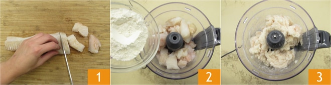 Para preparar os palitos de peixe, corte o bacalhau em pedaços 1 e coloque-o em um processador de alimentos com lâminas junto com a farinha 2. Bata até que o bacalhau se desprenda das paredes 3.