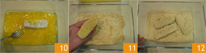 Passe cada palito nos ovos batidos com sal e pimenta 10 e na farinha de rosca 11, repita esta operação duas vezes para ter uma crosta mais crocante 12.