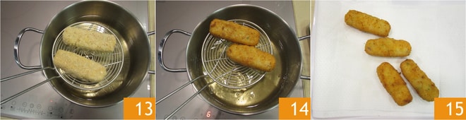 Aqueça o óleo a 165°C, frite no máximo dois palitos por vez 13 por cerca de 2 minutos, até que fiquem bem dourados 14. Escorra os palitos de peixe em papel absorvente e sirva-os quentes 15.