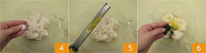 Transfira para uma tigela e tempere com sal 4, raspas de limão 5 e salsa picada finamente 6. Misture para incorporar.