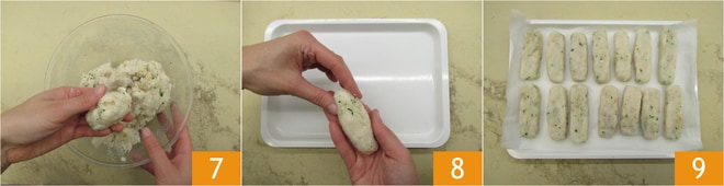 Pegue uma porção de massa de cerca de 55 g 7 e molde com as mãos molhadas 7 tentando obter um palito achatado 8. Coloque os palitos em uma bandeja forrada com papel manteiga 9.