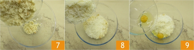 Transfira as migalhas de pão para uma tigela 7, adicione o Pecorino ralado 8 e os ovos 9.