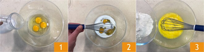 Para preparar as panquecas gigantes americanas, coloque em uma tigela os ovos e o leite 1, bata com o batedor 2 para misturar os líquidos e, em seguida, adicione a farinha 3.