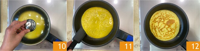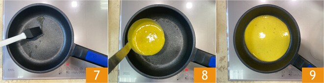 Agora pincele uma frigideira antiaderente de 18 cm de diâmetro com óleo 7. Despeje uma concha de massa 8 e gire a frigideira para distribuí-la no fundo 9.
