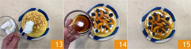 Uma vez prontas, coloque as panquecas em um prato, espalhe iogurte grego 13 por cima, decore com mirtilos e fatias de damasco, e depois despeje xarope de bordo a gosto 14. As panquecas gigantes americanas estão prontas, sirva imediatamente 15.