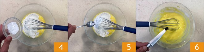O fermento 4, o sal 5, uma pitada de açúcar e as sementes da vagem de baunilha 6. Misture para obter uma massa lisa e sem grumos.
