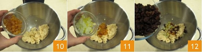Quando for absorvido, pause a batedeira por um momento e adicione a laranja 10, o cidrão 11 e as passas, previamente lavadas em água corrente e secas 12.