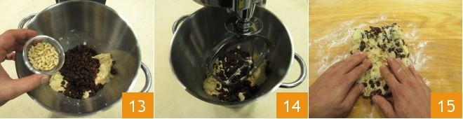 Por fim, adicione os pinhões 13. Ligue novamente a batedeira por cerca de 10 segundos em velocidade média para misturar bem os ingredientes 14. Transfira então a massa para uma superfície de trabalho e compacte a massa com as mãos 15.
