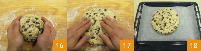 Dê uma forma arredondada a ela 16. Neste ponto, pressione levemente com as mãos a parte superior do bloco para achatá-la levemente 17. Deslize as mãos ao longo das bordas da massa para ajustá-las e dar uma forma de disco bem definida ao pandolce: você obterá um disco com cerca de 3 cm de altura e 10 cm de diâmetro. Em seguida, coloque-o em uma assadeira forrada com papel manteiga 18.