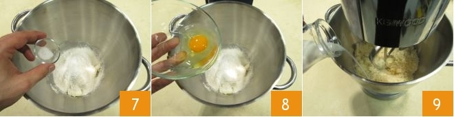 Adicione o sal 7 e o ovo 8 e comece a misturar em velocidade média. Enquanto mistura, adicione o leite em temperatura ambiente aos poucos 9.