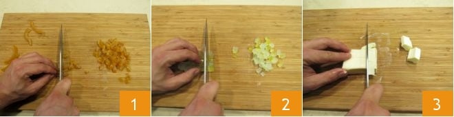 Para preparar o pandolce genovês, comece cortando em cubos a laranja 1 e o cidrão cristalizados 2. Passe agora para a manteiga em temperatura ambiente, que você cortará em pedaços 3.
