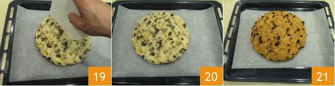 Com a ajuda de uma espátula ou uma lâmina afiada, faça uma decoração em forma de losango na superfície, fazendo cortes diagonais 19. Agora você pode assar seu pandolce em forno estático pré-aquecido a 180°C por 45-50 minutos (ou em forno ventilado pré-aquecido a 160°C por cerca de 35-40 minutos) 20. Após o tempo de cozimento, retire do forno e deixe descansar por alguns minutos 21 antes de levar à mesa esta delícia natalina!