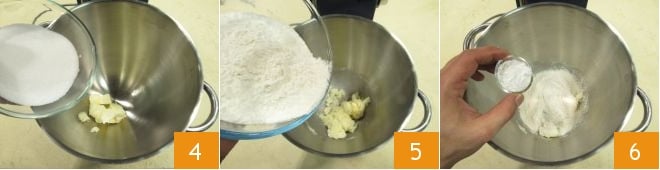 Em seguida, pegue uma batedeira com pá em que adicionar a manteiga e o açúcar 4, a farinha peneirada 5 e o fermento em pó 6.