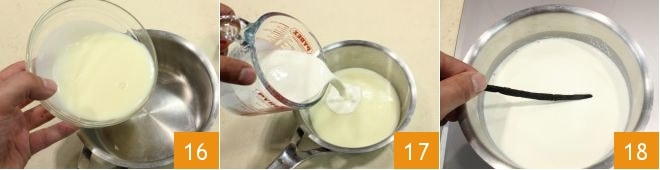 Enquanto isso, prepare o creme inglês: coloque o leite condensado em uma panela 16, depois adicione o creme de leite 17. Coloque a panela em fogo baixo e infunda uma fava de baunilha aberta 18: leve tudo para ferver.
