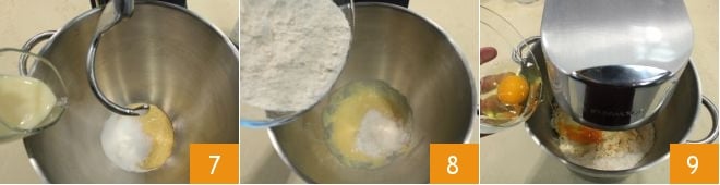 depois o leite condensado 7 e a farinha peneirada 8; então, ligue a batedeira equipada com a pá e adicione os ovos, um de cada vez, esperando que o anterior seja incorporado antes de prosseguir com o próximo 9.